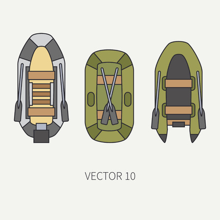 フラット ベクトル フィッシャーとキャンプ アイコン膨脹可能なゴム製のボートを行します 漁師の機器 レトロな漫画スタイル イラストやデザイン 壁紙の要素 のイラスト素材 ベクタ Image